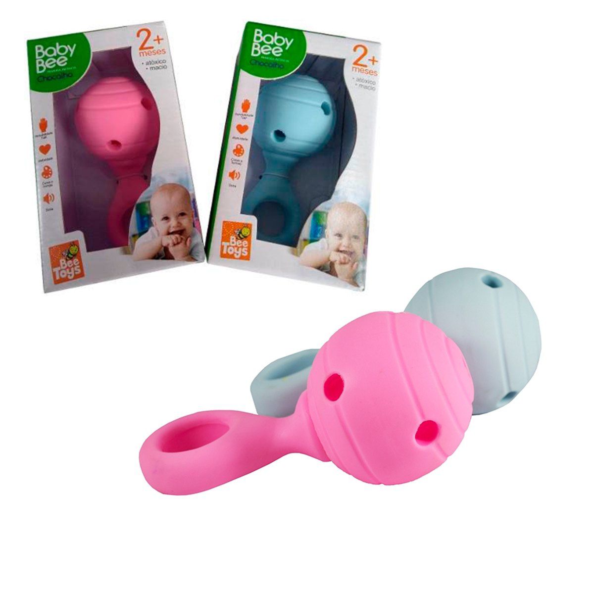 Feito de material atóxico é perfeito para se usar como chocalho e mordedor.